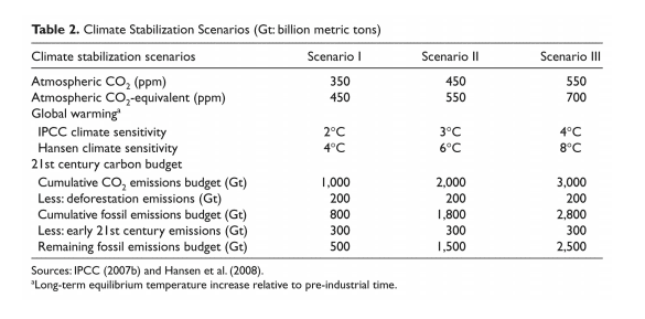 Para estabilizar las partículas de CO2 a 350 ppm, lo que ya traería graves consecuencias climáticas (un aumento de la temperatura de 2 a 4ºC), las emisiones fósiles totales en lo que queda de siglo (!) no deben sobrepasar el billón (español) de toneladas métricas. Es decir, tomando de referencia 2011 la emisión de CO2 por culpa de los combustibles fósiles se debía reducir a un 5,5% anual. Para 2050, una reducción total del 90% de emisiones. En un escenario mucho peor, a 450ppm (con un aumento de hasta 6 grados celsius), no se deberían exceder los 1,5 billones, lo cual supondría una disminución anual del 1,5%. 8