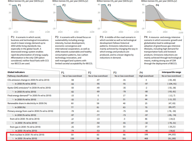 También me parece destacable el hecho de que la mayor descarbonización ocurrida hasta la fecha haya venido de mano de las nucleares. Remata y aleja la oscura pretensión de ciertos partidos izquierdistas y buena parte del movimiento ecologista de acometer una «desnuclearización». Desatendiendo, por cierto, al propio Grupo Intergubernamental de Expertos sobre el Cambio Climático. O desnuclearización o descarbonización, elijan ustedes. El IPPC lo tiene claro: Para 2050, 3 de los 4 planes que contemplan para estabilizar las emisiones de CO2 y la temperatura global en un óptimo habitable prevén hasta un 500% de subida de la utilización nuclear. En el único de los 4 en que no hay un aumento nuclear, se mantiene a los niveles actuales.
